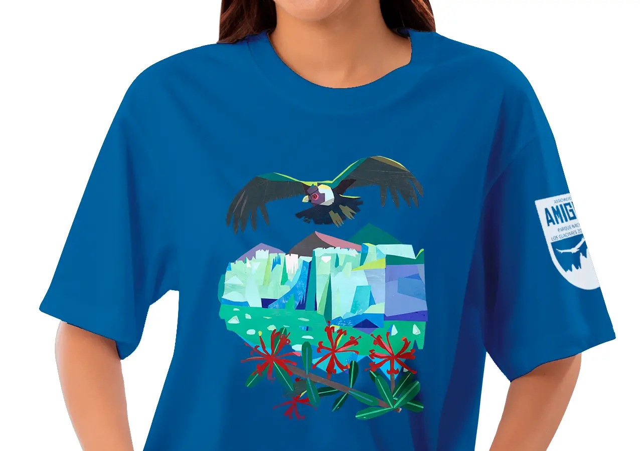 Confeccionada en algodón peinado 100% de alta calidad, esta remera de Elbrus es suave, durable y de calce holgado. La estampa fue realizada por el artista Tatu Daels y retrata al majestuoso cóndor andino sobrevolando el glaciar Perito Moreno, acompañado por flores de notro.